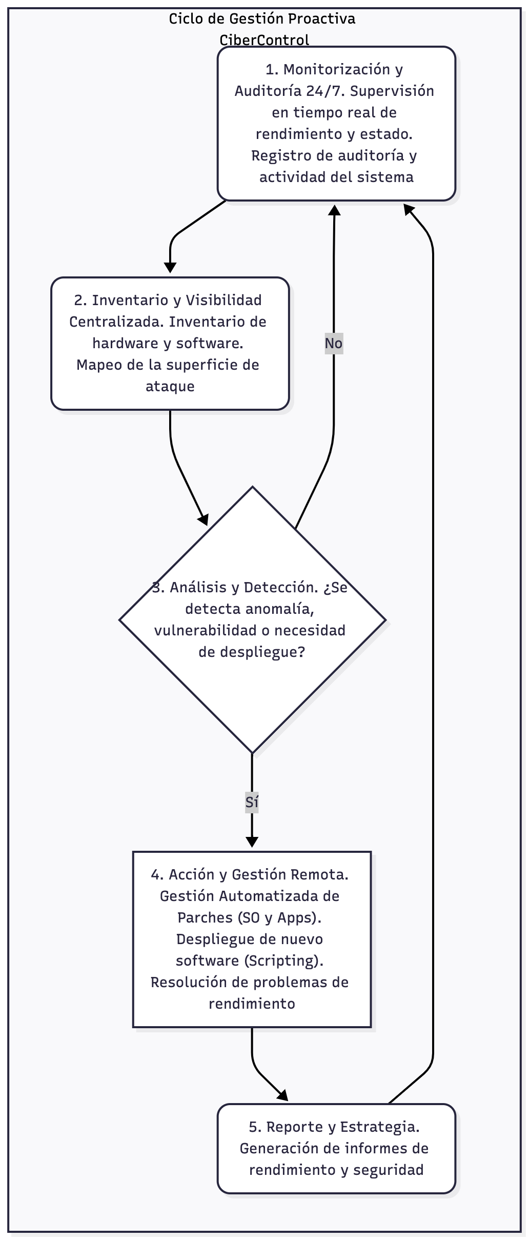 Como parte de CiberSafe Plus, incluye la plataforma RMM (certificada SOC 2), gestión y monitorización por un Técnico Dedicado, automatización de parches, inventario de hardware y software, generación de informes e integración nativa con CiberComplet Plus.