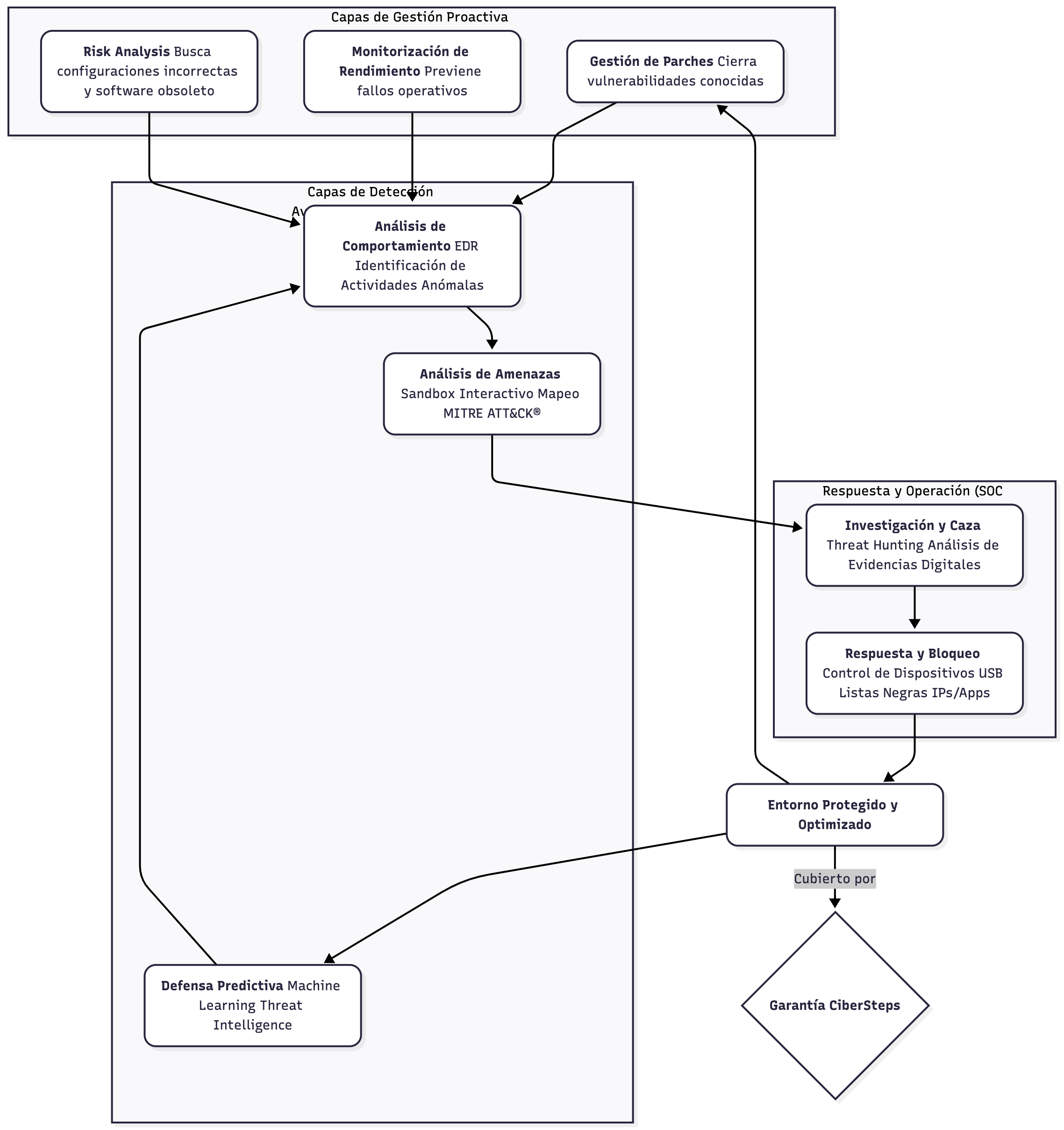 CiberComplet Plus es una solución de seguridad diseñada con una arquitectura de defensa profunda que aborda el ciclo completo de las amenazas, desde la prevención de ataques de día cero hasta la remediación automatizada y la gestión del riesgo.
